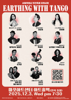 [공감신문] 최선은 기자= 기술과 예술이 결합된 공연 ‘어싱위드탱고(Earthing with Tango)’가 오는 12월 3일 오후 7시 30분, 마포아트센터 아트홀맥에서 열린다. 서울시 시민참여축제지원사업에 선정된 이 축제는 성악, 뮤지컬, 탱고무용, 연주, 생성형 AI 영상 및 음악, 그리고 스토리텔링이 융합된 형태의 무대를 통해 관객에게 새로운 감각의 예술 경험을 제시한다.공연은 ‘Earthing(어싱)’이라 불리는 자연 치유 개념과 아르헨티나 탱고의 감정적 리듬을 결합한 작품이다. 무대 위에서는 몸과 음악, 움직임, 서사가