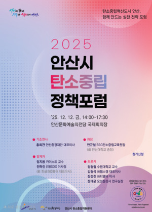 [공감신문] 정재은 기자=안산시, 안산환경재단, 안산시 탄소중립지원센터가 개최하는 2025 안산시 탄소중립 정책포럼이 내달 12일 막을 올린다.해당 포럼은 오후 2시부터 5시 30분까지 안산문화예술의전당 국제회의장에서 개최된다.이번 포럼은 탄소중립 정책의 국내외 동향과 과제를 진단하고, 안산시의 기후위기 대응 전략을 모색하기 위해 기획됐다. 포럼은 안산환경재단 홍희관 대표이사의 기조연설로 문을 연다. 이어지는 주제 발표 세션에서는 카이스트 엄지용 교수, 재단 SDX 전하진 이사장이 각각 탄소중립 관련 최신 연구와 정책 제안을 발표한
